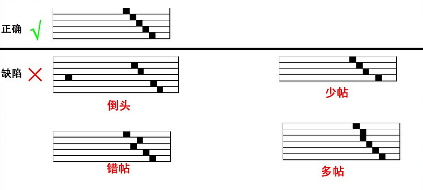 排書(配頁):配帖時不能有缺帖、多帖或后顛倒,為了幫助配帖和檢查 配帖可能發生的錯誤,在印刷時,每一印張的帖脊處,按帖序印上一個小黑方塊 稱為折標,通過配帖,書脊上就形成明顯的階梯狀的檢查標記,檢查時,只要發 現梯檔不成順序,就可發覺有誤而及時糾正。